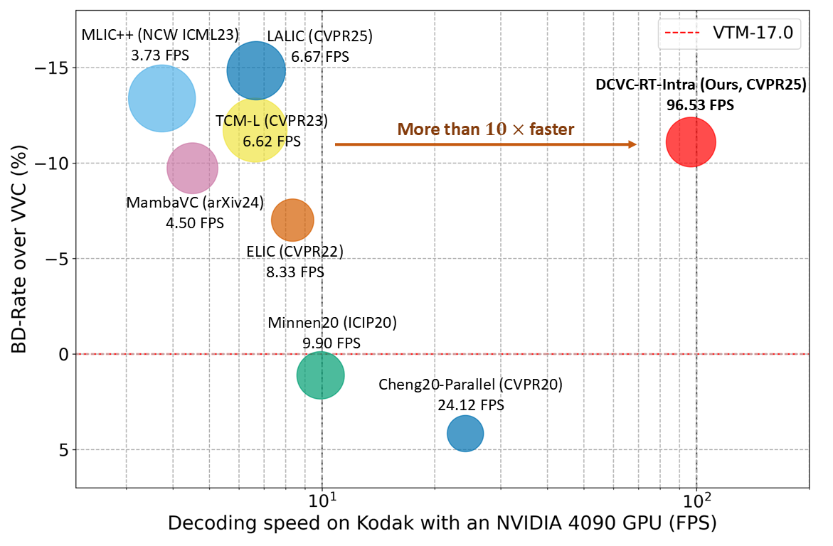 Notably, the intra-frame codec in DCVC-RT also delivers impressive performance. On Kodak, DCVC-RT-Intra achieves an 11.1% bitrate reduction compared to VTM, with a over 10× faster decoding speed than previous state-of-the-art learned image codecs. For encoding, DCVC-RT-Intra also offers a similar speed advantage. For 1080p content, DCVC-RT-Intra achieves an impressive encoding/decoding speed of 40.7 FPS / 44.2 FPS on an NVIDIA A100 GPU.