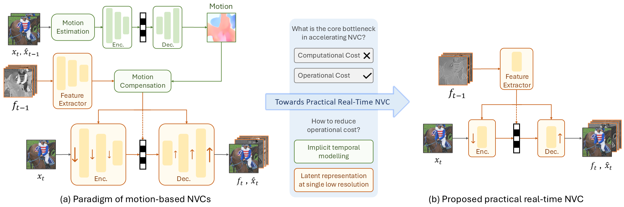 To accelerate NVCs, we rethink the complexity problem in this paper. In practice, both computational complexity (typically measured by the number of multiply-accumulate operations, MACs) and operational complexity (e.g., function calls and memory I/O costs) influence the actual coding speed. While most existing research focuses on computational costs, our experiments illustrate that operational overhead is the primary bottleneck in accelerating NVCs. This insight motivates us to design an NVC that minimizes operational costs.